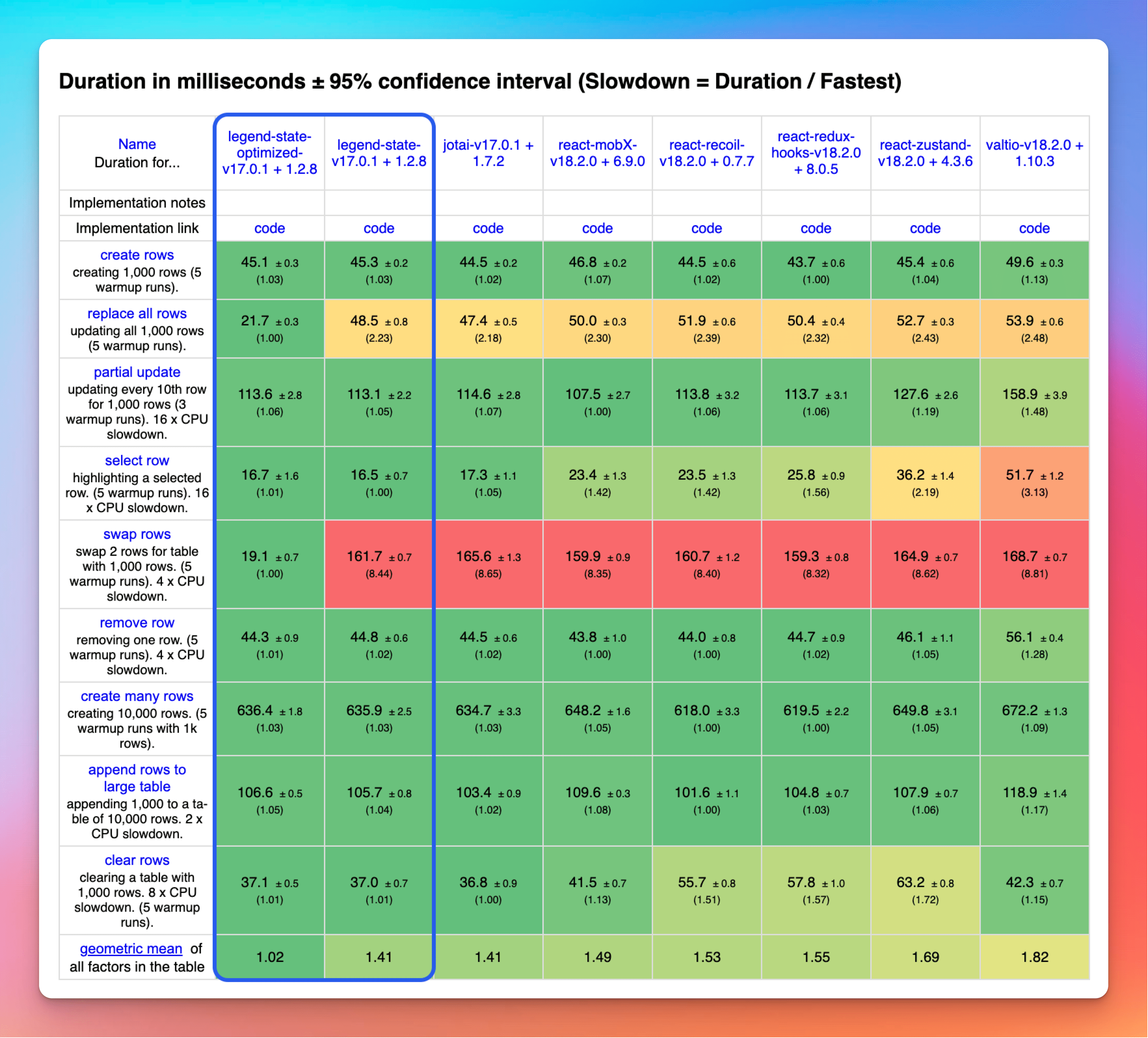 Legend-State beats other React state libraries in both speed and memory usage. An optimized mode for arrays can re-render only changed elements instead of the whole array, making it significantly faster than is usually possible with React - see it on the left side of this table from the krausest benchmark.