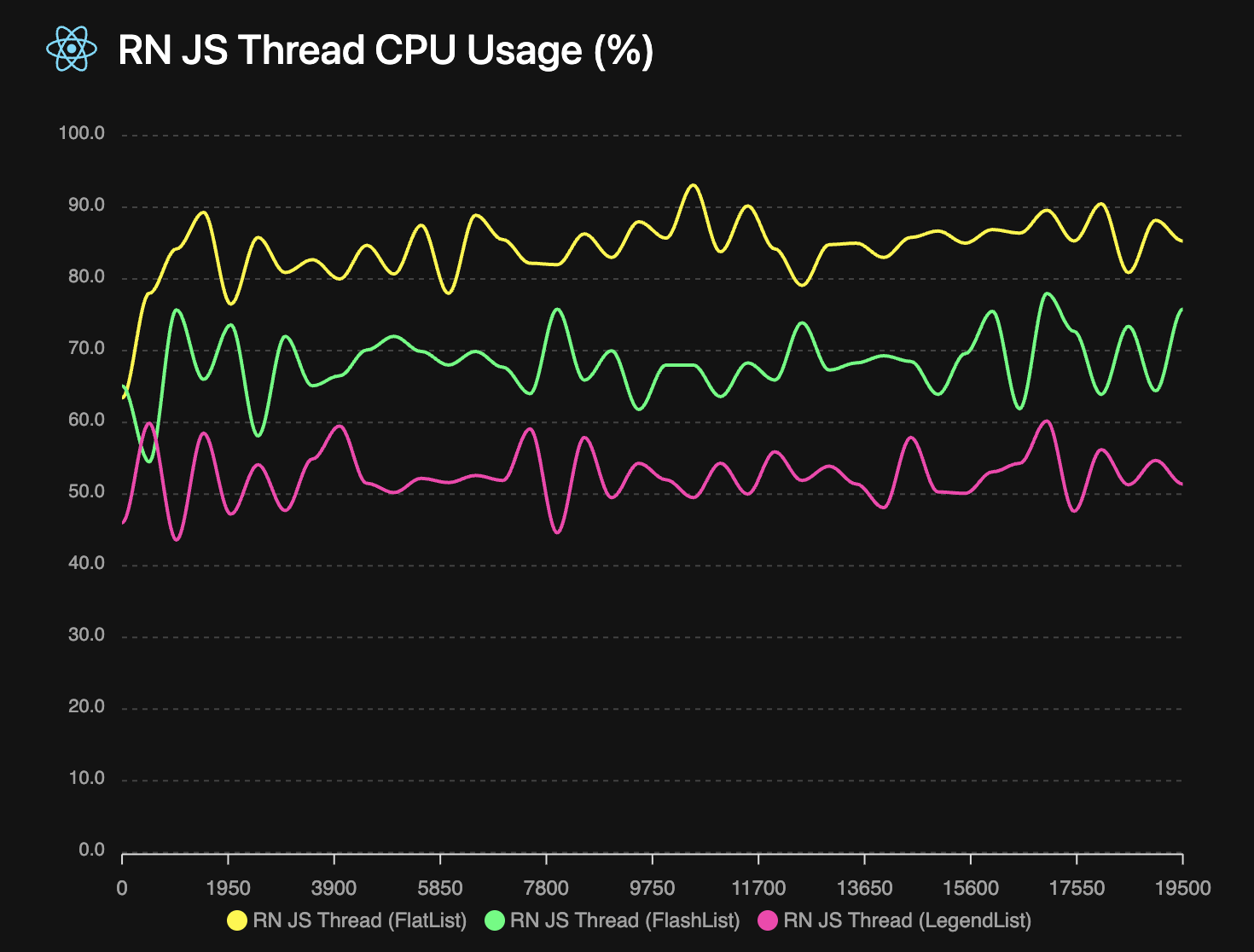 A FlashLight measurement of the above test shows that LegendList uses less CPU while scrolling. And it uses less memory too! See the FlashLight results for more details.